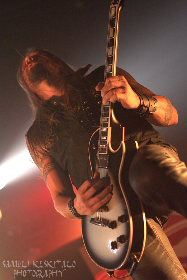 Allekirjoittanut ei varsinaisesti ole suomenkielisten spiikkien ystävä, mutta onhan se aina mukava kuulla, kun muusikko jakelee kiitosta vilpittömästi. Kiitosten jälkeen ja pienen puheen saattelemana oli vuorossa ”Bad Blood”. Näin ollen uudelta levyltä heti kärkeen kolme biisiä putkeen – voisiko paremmin alkaa? Valittamista ei myöskään ollut siinä, kuinka biisivalinnat jatkuivat tästä eteen päin, kuten esimerkiksi ”Sky Is Mine”, joka keikkuu edelleen oman Joutsenen aikaisen Amorphiksen Top3:ssa, eikä vähiten soolokitaristi Esa Holopaisen upeasta riffistä johtuen. Tänä vuonna pyöreät 40 vuotta mittariin saanut Tomi Joutsen ei myöskään tuntunut kärsivän minkäänlaisesta ikäkriisistä vokaaleitten osalta, vaikka laulaja toikin ennen vanhemman tuotannon esittämistä esille mahdollisesti kohta lähestyvistä harmaista hiuksista, heh. Joten älä huoli, Tomi: tuolla lavatyylillä ja lookilla ei vanhene koskaan!