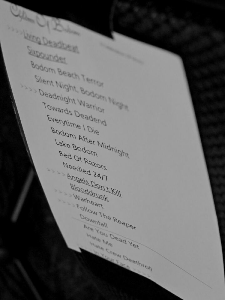 Molempina iltoina kuultiin sama settilista. Se koostui bändin kuuden ensimmäisen albumin materiaalista, joista tuorein oli ”Blooddrunk”-albumin (2008) nimikappale.