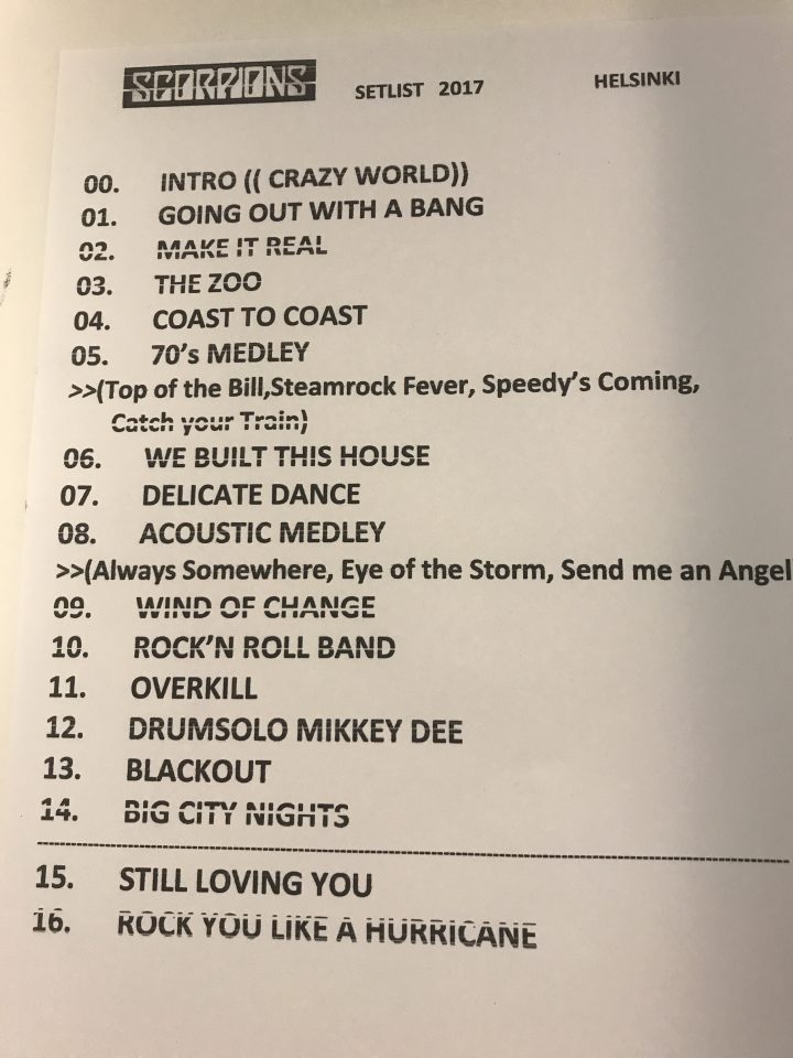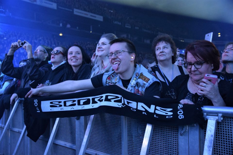 Kellon lähestyessä iltayhdeksää areenan yleisöstä oli aistittavissa kliseisesti suuren urheilujuhlan henkeä, sillä sen verran lähellä oli jo vuonna 1965 Hannoverissa perustetun hard rock -legendan Scorpionsin keikka. Etukäteen olin tutustunut bändin kiertueen settilistaan, jonka perusteella hieman epäilin, mikä tulisi olemaan ensi toukokuussa 70 vuotta täyttävän vokalisti Klaus Meinen äänen kunto.