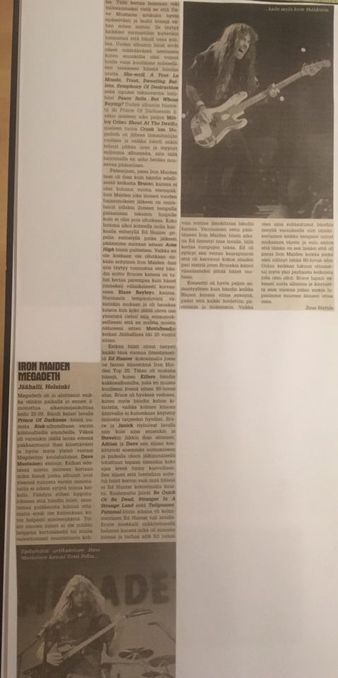 Tunnelma Jäähallissa oli katossa ja yleisö eli täysillä mukana jokaisessa sekunnissa. Tuntui kuin olisi ollut todistamassa jonkinlaista uudelleentulemisen rituaalia, joka yhdisti perinteiselle metallille vaikean vuosikymmen lopussa yhä genrelle uskolliset ystävät. Konsertti on metallimusiikin saralla yksi kaikkien aikojen parhaista, joita olen itse ollut todistamassa. Maiden oli jälleen nälkäinen ja halusi todistaa nousevansa uudestaan musiikkityylin terävimpään kärkeen.