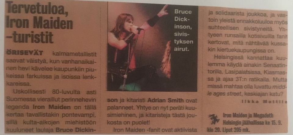 Katso alta setti lehtileikkeitä, keikkaan liittyvää materiaalia, Bruce Dickinsonin ja Adrian Smithin haastattelu Jyrki-ohjelmasta, videomateriaalia Helsingistä sekä 15.9.1999 konsertista nauhoitettu ”Futureal”: