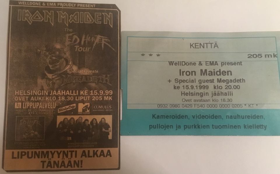 Helsinkiin rundi saapui 15.9.1999. Keikan lämmittelijänä toimi Megadeth, jonka juuri kiertueen alla julkaisema ”Risk”-levy oli entistä rohkeampi irtiotto kaupallisempaan suuntaan. Kitaristi Marty Friedman oli edelleen mukana, mutta rumpujen takana istui joitakin vuosia sitten edesmenneen Nick Menzan korvannut Jimmy DeGrasso. ”Risk” ei nostanut yhtyettä kaipaamalleen huippumenestyjän tasolle ja esitys Jäähallissa oli pahasti aneeminen. Mustaine mutisi lähes kaikki kappaleiden sanat epäselvänä puhelauluna, ja bändissä ei tuntunut olevan enää aitoa soittamisen iloa. ”Crush ’Em” -singlen kajahtaessa ilmoille bändi yritti turhaan saada virtaa uskonsa thrash veteraaneihin menettäneeseen yleisöön. Onneksi Megadeth nousi tästä ahdingosta, 17 vuotta myöhemmin näin yhtyeen Sweden Rockissa ja esitys oli kuin eri planeetalta.