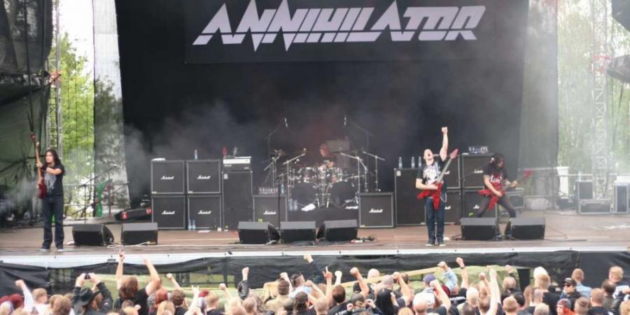 lähempänä puolta viittä. Ehdin nähdä vain pari viimeistä biisiä, joiden aikana nuoret miehet ehtivät ainakin tämän vanhan miehen vakuuttaa taidoillaan. Seuraavana bändivalinta tuotti minulle ongelmia: sisälavalla vuorossa oli hyvien ystävieni orkesteri Sadistik Forest ja päälavan valtasi Annihilator. Tällä kertaa päätin juosta lavalta lavalle, aloittaen Annihilatorista jatkaen Sadistikilla ja lopettaen Annihilatoriin. Annihilator aloitti settinsä kolmikolla Suicide society, No way out ja Creepin’ again. Orkesteri oli hämmentävän tiukka, soundit olivat viimeisen päälle ja soitto kulki. Suuntasin tämän jälkeen tarkistamaan missä kunnossa Sadistik Forest on. Oulu-Iisalmi-Tampere-akselilta ponnistava Dödis-pumppu iski kuin se kuuluisa miljoona volttia. Soitto oli tiukkaa ja vihaista, josta oli aistittavissa sopiva määrä raivoa ja vitutusta. Sadistisen metsän keikalta suuntasin vielä tarkistamaan Annihalatorin keikan lopun, joka huipentui Alice in hell ja Human incecticide-kaksikkoon. Kaksi mainiota keikkaa osuivat nyt päällekkäin. Näitä sattuu festareilla aina, joten mitäpä tässä nillittämään.