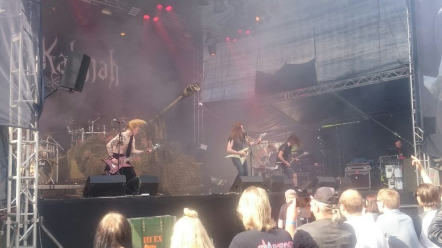Seuraavana suunnaksi otettiin päälava, jossa Kalmah aloitti esitystään. Odotin tältä keikalta paljon ja paljon myös sain. Äijät vetivät unohtumattoman shown ja laulajakitaristi Pekka Kokko viihdytti yleisöä välispiikeillään, jotka vaihtelivat keski-ikäisen rokkarin jaksamisesta juomiseen ja hillan poimimiseen. Yleisöä oli kertynyt ajankohtaan nähden mukava määrä, mutta varmasti aikainen soittoaika verotti osaltaan. Tosin Kokko mainitsikin, että mukavaa kun järjestäjä on kerrankin laittanut pääesiintyjän alkupäähän soittamaan. Edellä mainituista syistä itsensä ”Swamplordin” pyytämä wall of death jäikin lähinnä muutamien ihmisten ryntäilyksi. Pienenä miinuksena eräissä kappaleissa bassorumpujen alle hautautui suuri osa muista instrumenteista, mutta muuten kyseessä oli erittäin hyväsoundinen keikka.