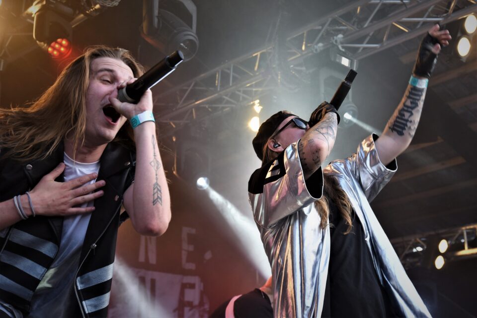 Saku ”Shag-U” Solin ja Petja ”MC Raaka Pee” Turunen mahtuvat mikkiongelmien järjestelemisen ajan laulamaan samaankin tööttäimeen.
