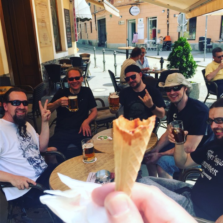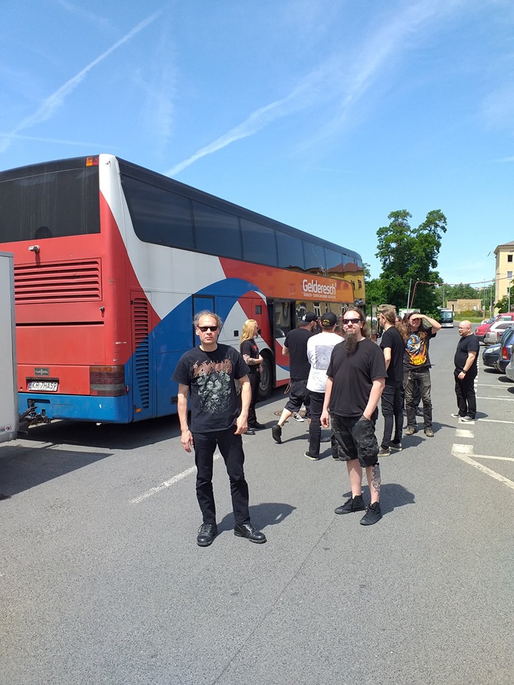 Prahan lentoasemalla kiertuemanagerimme Martin oli sitten pöllöjä vastassa. Kuulemma alkoi tehdä heti kaljaa mieli kun seurueen näki. Ymmärrettävää. Hyvin hän hermonsa hillitsi ohjatessaan meidät komeaan nightlineriin missä oli jo valmiina Nunslaughter sekä kiertueemme merchandise-myyjä Mira. Sveitsin metallimiekkoset Disparaged sekä kiertueen ääniteknikko Florian saapuvat suoraan illan venuelle. Seuraavaksi suunnattiin hakemaan kiertueelle tuleva vuokrabackline. Kaikki soittivat samoilla vermeillä rumpuja myöten mikä helpotti suuresti lavalogistiikkaa. Toki jokaisella soittajalla oli omat instrumenttinsa ja efektinsä, rumpaleilla peltinsä ja pedaalinsa mutta perussetti pysyi samana joten vaihdot pysyivät todella tiukkoina. Näillä ensimmäisillä keikoilla päädyttiin myös siihen että Bloodride teki soundchekin ja pääbändiä myöten muille riitti pikainen linecheck. Loppureissusta sattuneesta syystä Nunslaughter alkoi myös tekemään soundcheckiä.