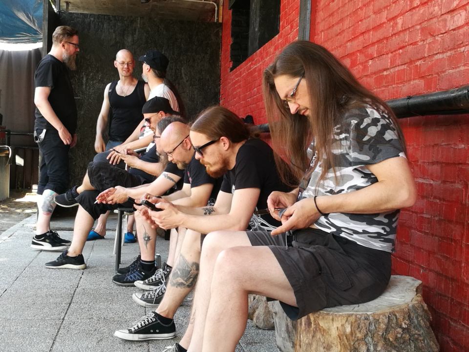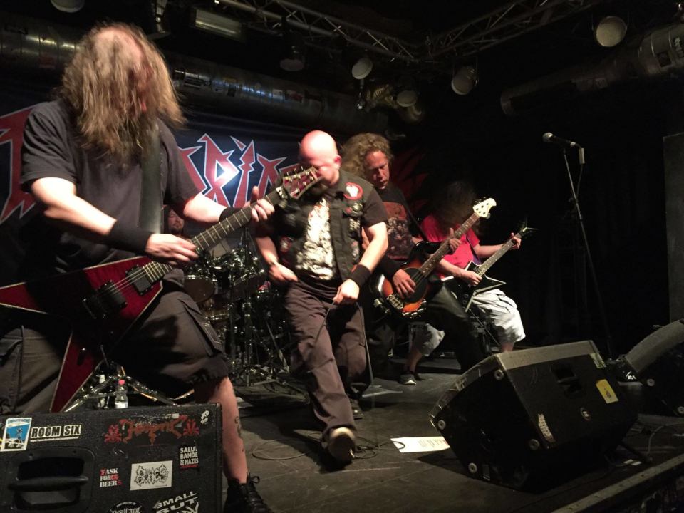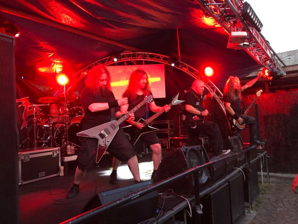 Hiljalleen paikan henkilökunta saapui ja load-in alkoi. Seurasikin sitten pikku ylläri. Keikka vedetään isolla ulkolavalla ja paikan sisätilat on valjastettu pelkästään bäkkäriksemme. Kyllähän se meille sopii! Tarjoilut olivat kohdillaan ja lavasoundit saatiin sopiviksi että ei kun odottelemaan illan vetoa. Odotukset olivat korkealla varsinkin kun keikkapaikan edessä parveili thrash-liivinuorisoa jo monta tuntia ennen ovien avaamista. Vaan jengin keikkakäytös olikin sitten mallia suomi ja maanantai-ilta. Paria reipasta eturivissä tukkaa pyörittänyttä nuorta miestä lukuunottamatta suhteellisen harvalukuinen yleisö lähinnä tuijotti meitä, joskin toki biisien väliin antoi kohteliaat huudot ja aplodit. Sama jäykistely jatkui jokaisen bändin kohdalla. Se ei kuitenkaan ketään lannistanut vaan jokainen antoi kaikkensa ja voi sanoa että keikkojen jälkeen lava oli vaarallisen liukas hiestä.