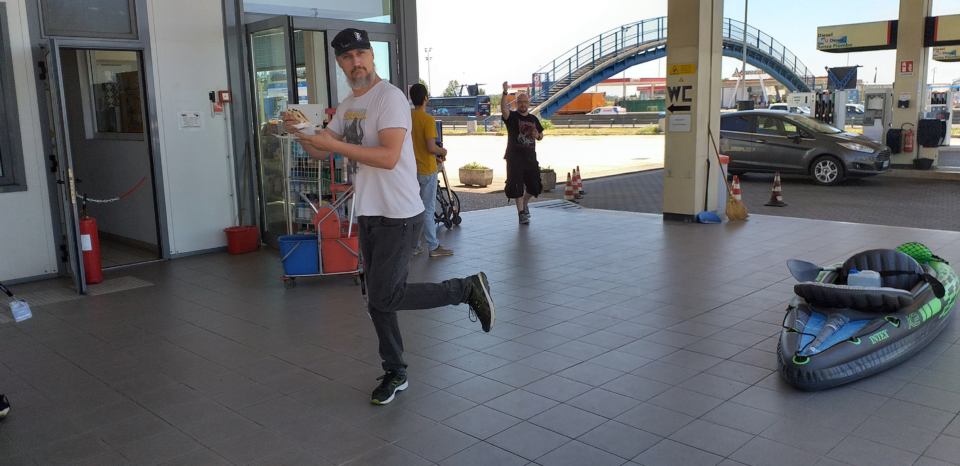 Yöllä, niin kuin joka siirtymällä, bussimme pysähtyi pariin otteeseen eri yöhuoltoasemille. Kiertuebussin ykkössääntö on että siellä ei paskanneta joten näillä stopeilla yllättäen miesten vessojen pönttöpuolelle tuppasi tulla vähän jonoa. Asioinnin päätteeksi jengi osteli tarpeen mukaan erinäistä evästä mukaan ja taas on the road. Huoltamoiden muu asiakaskunta seuraili välillä vähän ihmetyksen ja kauhunsekaisin ilmein seurakuntamme saapumista. Turhaan. Tatuoinneista, pitkistä hiuksista ja naamakarvoista huolimatta uskallan väittää porukkamme olleen noiden paikkojen ystävällisimpiä ja kohteliaimpia yövieraita.
