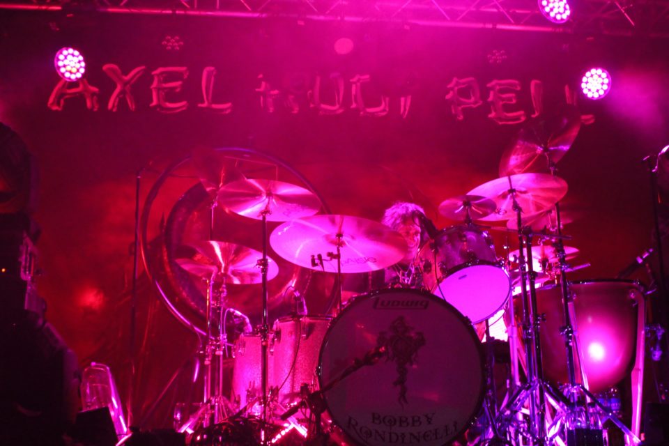 Soundit pienessä paikassa toimivat yllättävän hienosti. Gioelin ääni täytti huoneen ja satunnaisia pahasti korvaan särähtäneitä kitarakaiutinten äänenkiertoa lukuun ottamatta Axelin kuuluisat nuotit soivat myös kirkkaasti. Pell ei tekniikaltaan ehkä yllä lajityylin pioneerien Malmsteenin ja Blackmoren tasolle, mutta hienoja kappaleita ja melodioita on miehen historiasta saatu fanien iloksi lukemattomia määriä ja kaikein tärkeimpänä kitaristi omaa tilannetajun antaa muille musiikoille tilaa valtaamatta jatkuvasti alaa omalla tilutuksellaan. Vaikka rumpujen yläpuolella kankaassa Axel Rudi Pell lukikin, tuntui nimenomaan kuin olisi seurannut soittamisen iloa huokunutta ja yhteen pelaavaa yhtyettä, eikä tähtikitaristin sooloesitystä.