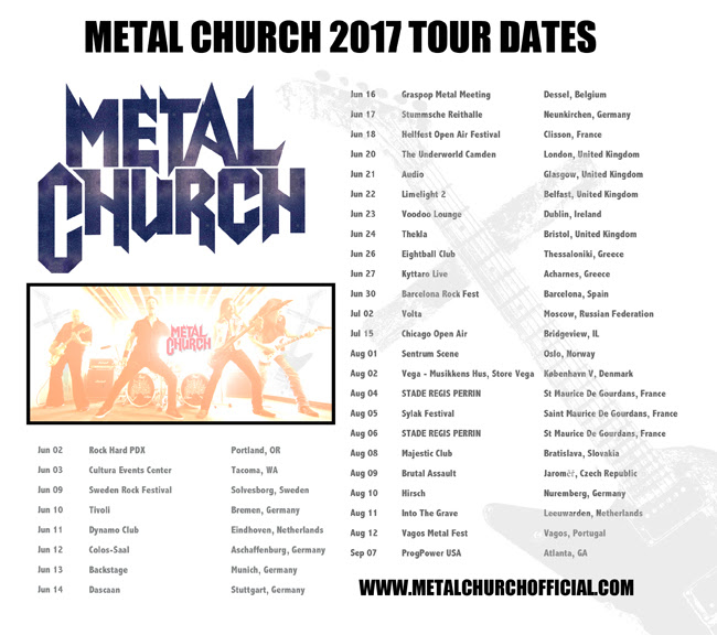 Pitkän linjan amerikkalainen metalliyhtye Metal Church on julkaissut uuden musiikkivideon “Reset”. Biisi on nostettu yhtyeen viime vuonna ilmestyneeltä laulaja Mike Howen paluualbumilta ”XI”. Bändi viettää koko alkavan kesän kiertueella Euroopassa. Mukana on yhtyeen uusi rumpali, entinen W.A.S.P.-jäsen Stet Howland, joka korvaa keväällä Metal Churchin riveistä poistuneen Jeff Platen.