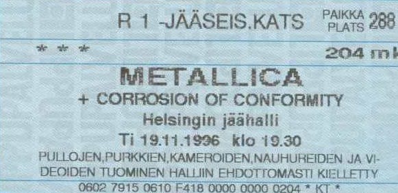 Metallican settilistat Suomen keikoilta: 18.11.1996 ja 19.11.1996.