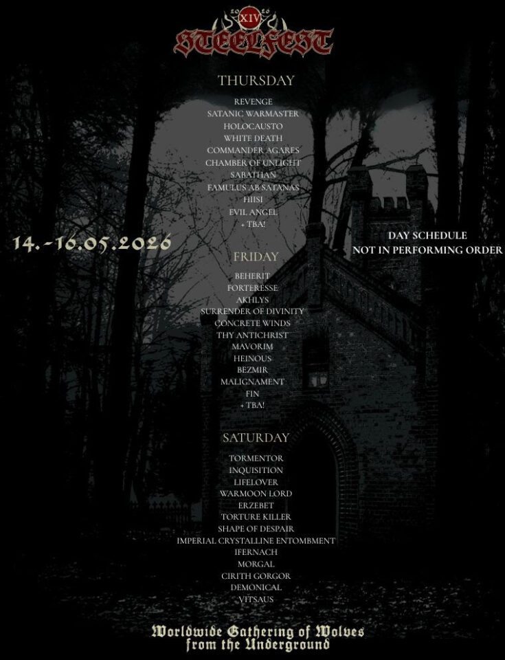 Hvyinkäällä 14.-16.5.2026 järjestettävä äärimetallifestivaali Steelfest on julkistanut päiväkohtaiset esiintyjät. Tapahtumaan on myös lisätty artistit Lifelover, Fin (joka korvaa Autumn Strife -yhtyeen) sekä Evil Angel.