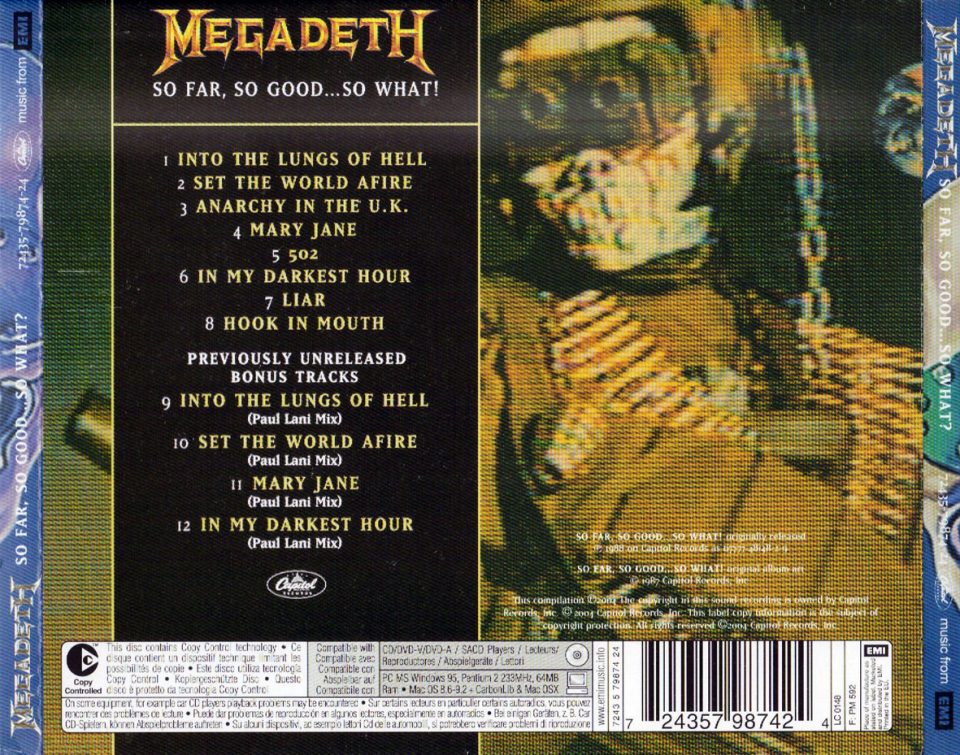”So Far So Good… So What!” vei Megadethin teknistä, vihaista ja nopeaa thrashia edelleen uusiin suuntiin. Levyn haaste on paljolti sen jääminen kahden mestariteoksen väliin. Vuoden 1990 ”Rust In Peacea” pidetään usein Megadethin parhaansa saavutuksena ja edellisellä ”Peace Sells…But Who’s Buying?” –albumilla rima oli niin ikään asetettu todella korkealle.